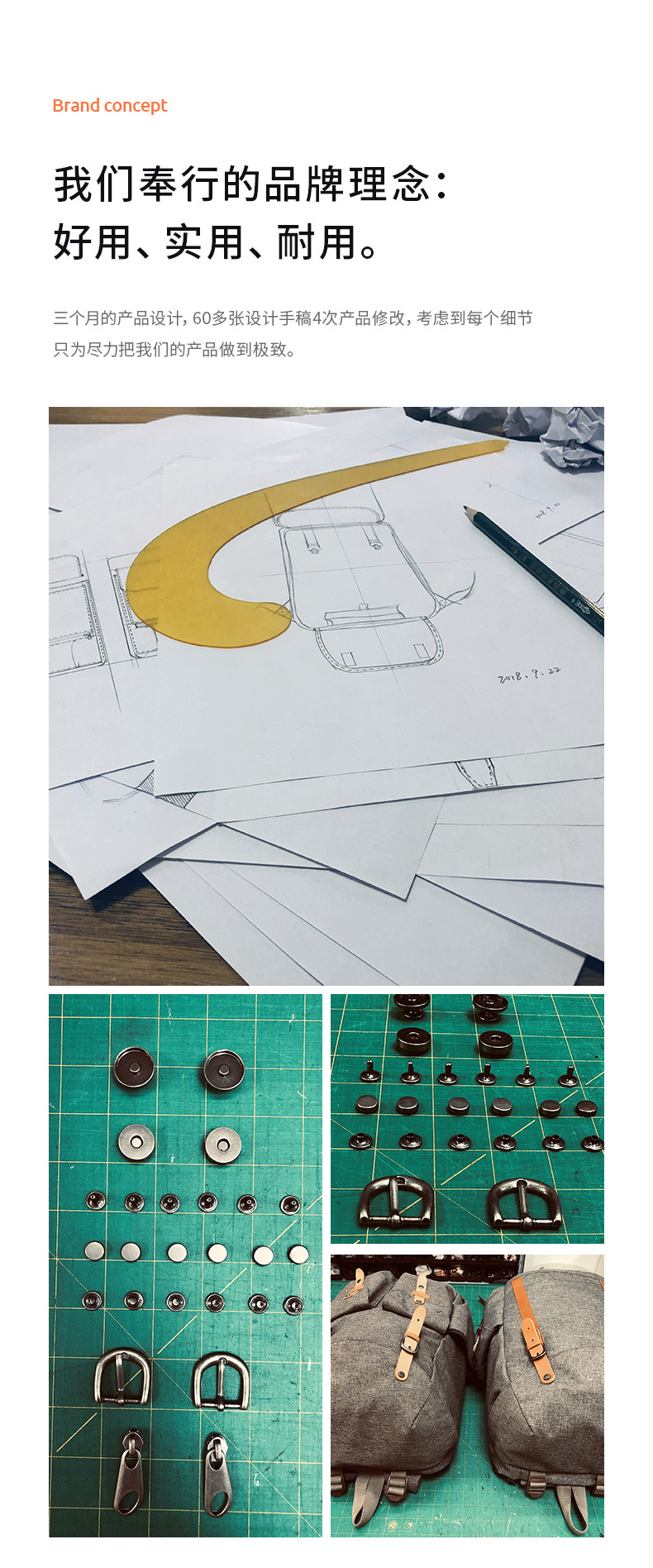 现在的背包仅仅只是满足普通大众的需求,对于相当一部分的客户还是很乏力。于是,LERIC决定重新定义背包的概念。因此三个月的产品设计,60多张的设计手稿,以及不厌其烦的修改,让他们将这款产品的细节做到极致。