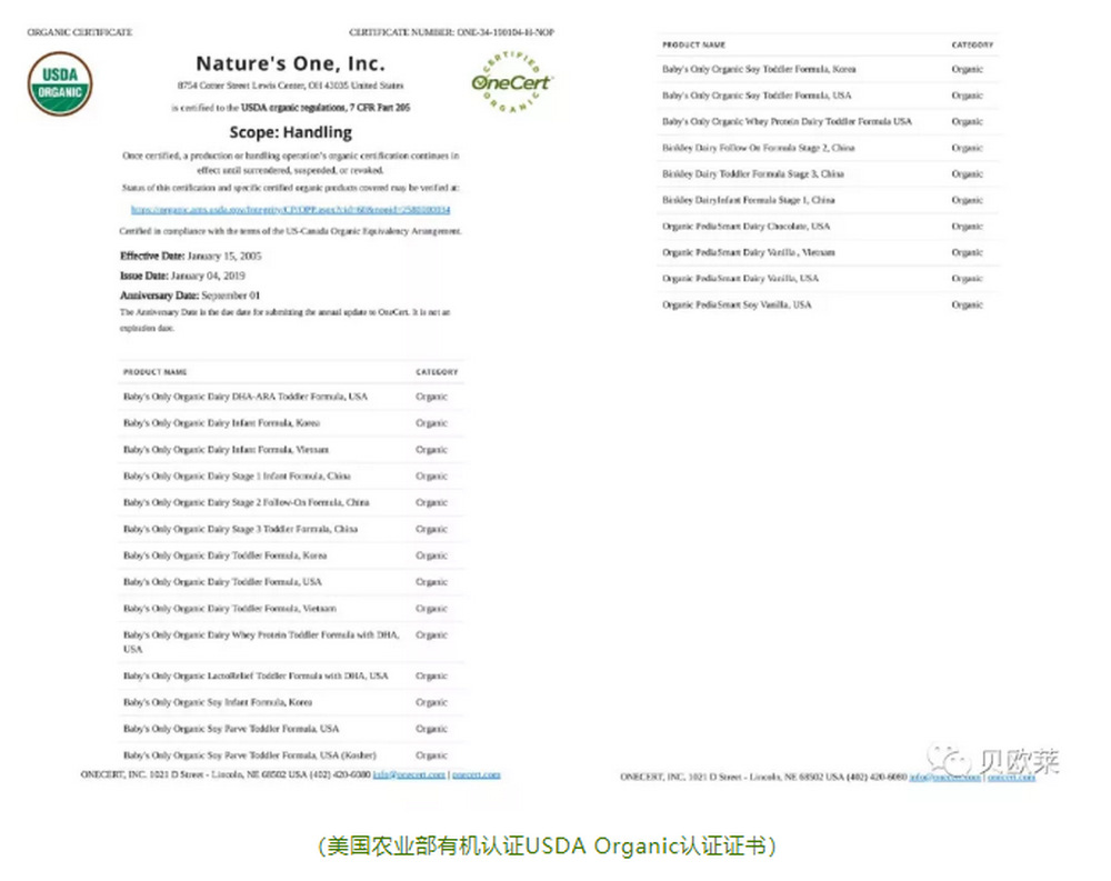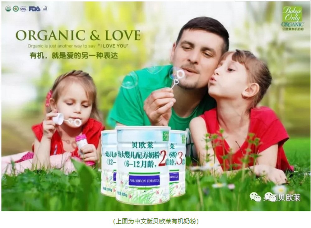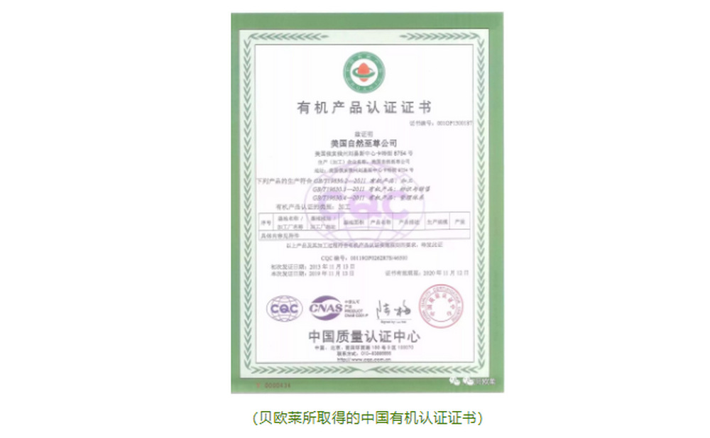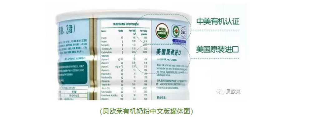根据我国《有机产品认证管理办法》的规定,未获得有机产品认证的产品,不得在产品或者产品包装及标签上标注"有机产品"、"有机转换产品"("ORGANIC"、"CONVERSION TO ORGANIC")等其他误导公众的文字表述。这意味着,只有获得中国的有机认证,才可以在产品外包装上标示有机产品字样。在中国销售的贝欧莱有机奶粉同时还获得了中国有机认证。
