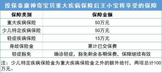 那么泰康人寿这款保障充足的少儿重疾险价格如何呢?举个例子,王先生为刚出生的儿子王小宝(0岁)投保泰康神奇宝贝重疾险,王先生为投保人及身故保险金受益人,王小宝为被保险人及疾病保险金受益人。基本保额50万,保至23岁,交至23岁,年交保费520元。在等待期过后,王小宝将享受以下保障: