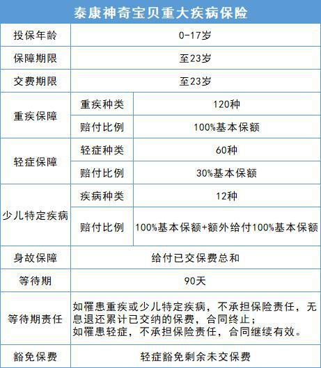 从重疾、轻症保障方面来看,泰康神奇宝贝重疾险涵盖120种重疾、60种轻症,保障范围在少儿重疾险中具有十分明显的优势。而且,作为泰康人寿专门针对未成年人设计的重疾险产品,泰康神奇宝贝重疾险0-17周岁均可投保,保至23周岁,等待期90天,年交保费,在保障期限方面十分适合未成年人。