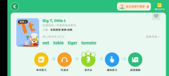 呱呱阅读还设计了“听、读、练”环节,每本书经过这一学习闭环的反复巩固,都会让孩子形成更加深刻的印象。在这一过程中,针对孩子不准确的发音,智能纠音功能会通过给孩子打分、纯正发音重复发声,来帮助孩子纠偏,一步步学会正确的读音。在这个过程中孩子可以完成英语自主阅读,这样即便家长没有太多时间进行辅导,呱呱阅读也能够智能为孩子纠正,完成整个有趣且有效的学习过程。