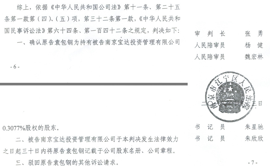 2018年10月13日,南京市江宁区法.院作出《(2017)苏0115民初12615号案民事判决书》,确认我为持有宝达公司0.3077%股权的股东,等等。