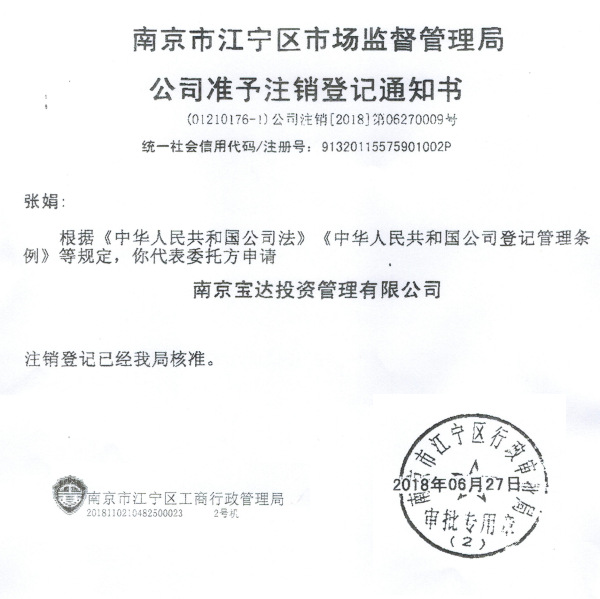 本以为事情就此告一段落,法.律主持了正义,然而2018年11月初, 南京市江宁区法.院于审理另案时,却发现:于法.院冻结本案讼争股权之后、作出《民事判决书》之前的 2018年6月27日,公司登记机关已经依据宝达公司的注销申请及2017年12月31日的股东会决议,核准了宝达公司的注销登记申请。