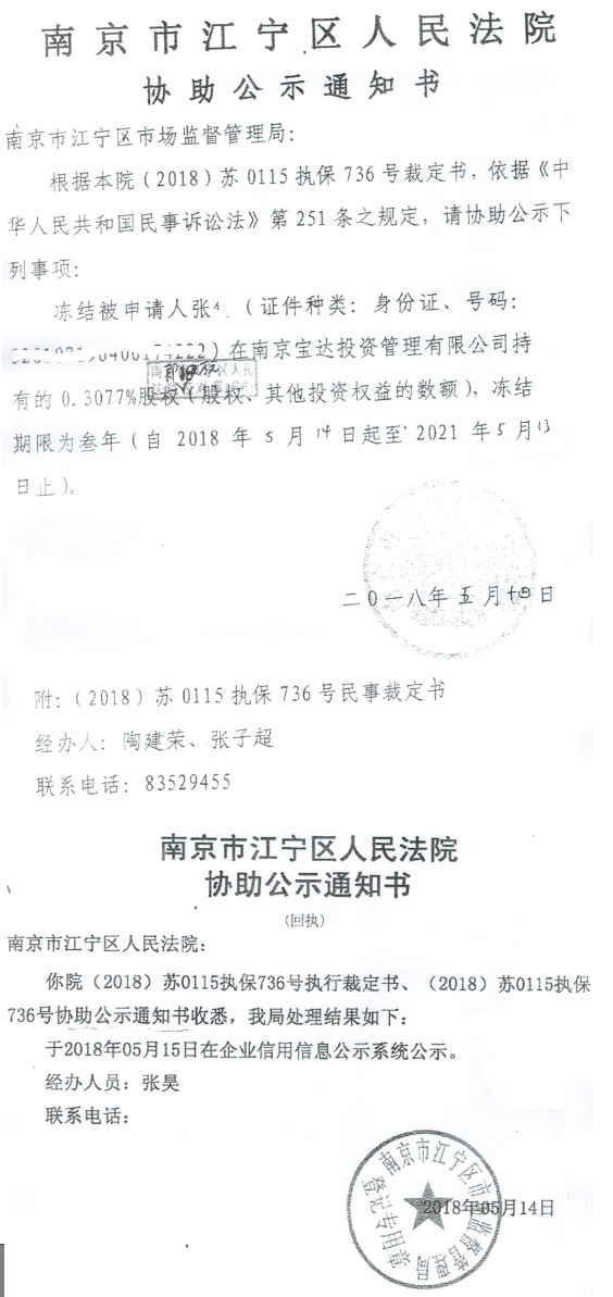 2018年5月14日,南京市江宁区法.院应我申请,作出并向南京市江宁区市场监督管理局送达《民事裁定书》、《协助执行通知书》、《协助公示通知书》、《协助公示执行信息需求书》等,冻结了张令名下的本案讼争的0.3077%股权,冻结期限3年(自2018年5月14日起至2021年5月13日止)。